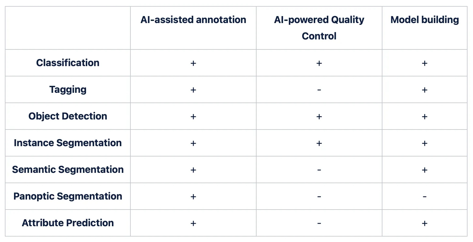 Hasty is focused on the vision AI field bringing such features as AI-assisted annotation, AI-powered Quality Control, and no-code model building solution. When it comes to the exact Computer Vision tasks, here are those that Hasty supports: