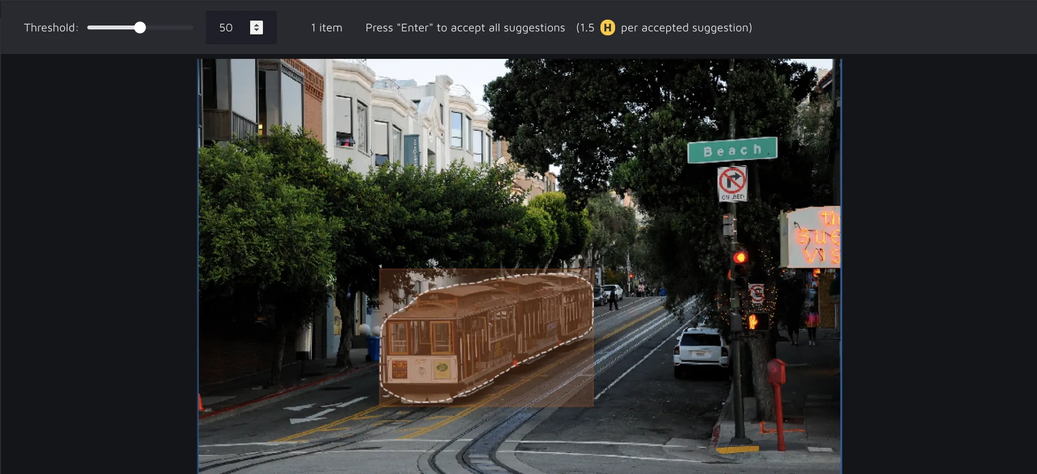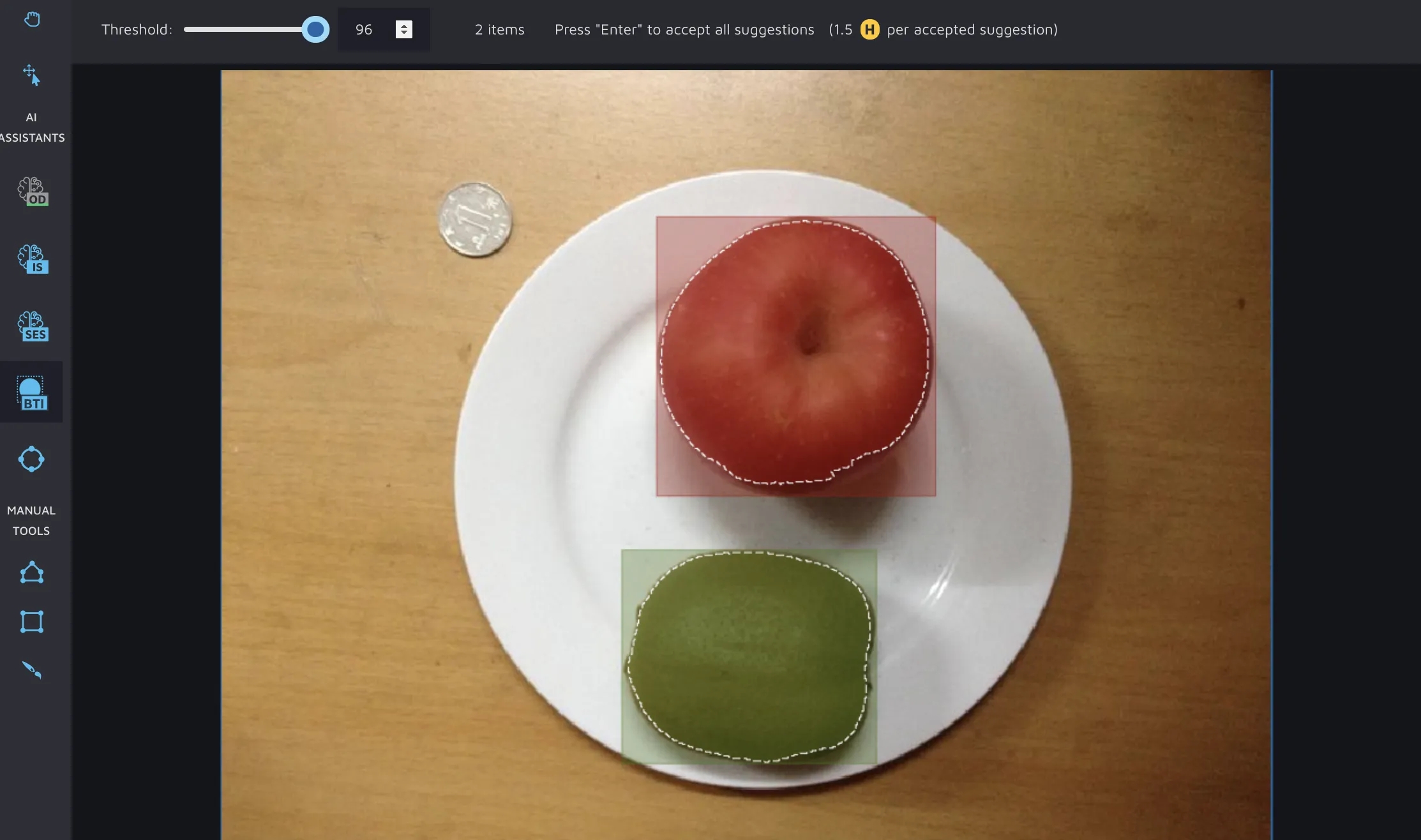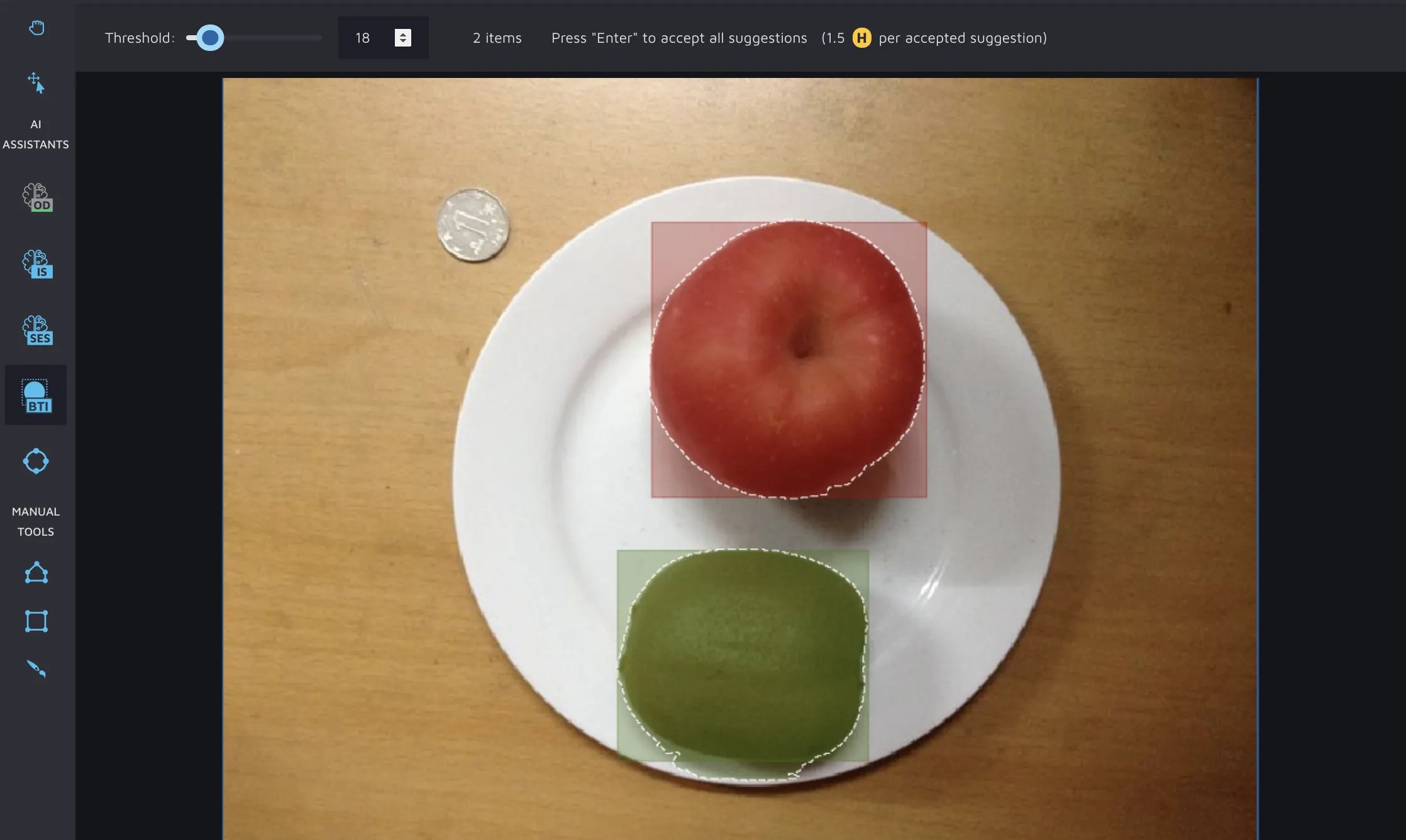 It works by first taking any bounding boxes on an image, and then using them as anchor boxes in which an AI model looks for instance shapes. The most likely shape is then presented to the user.