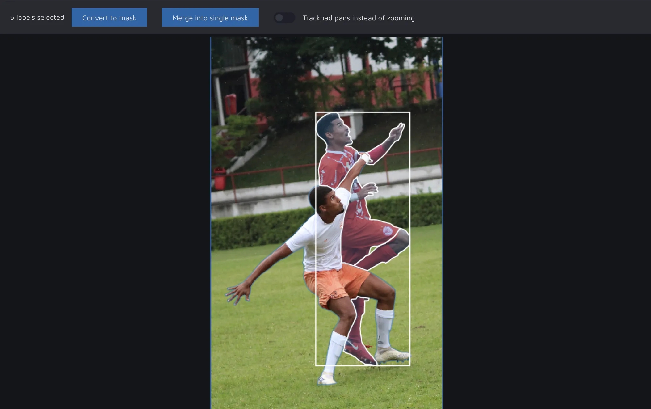 Or you can merge separate masks or polygons into one shape by first selecting all of them, and then click "Merge into single mask" (at the top in the annotation view).