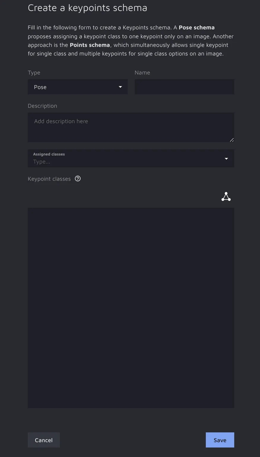 To create a keypoint class, please navigate to the Keypoint classes and click anywhere in the editor form.