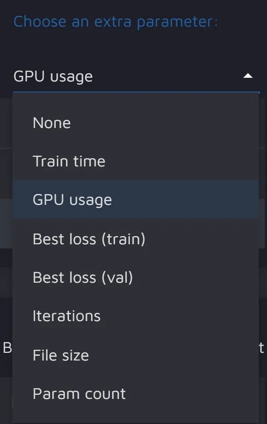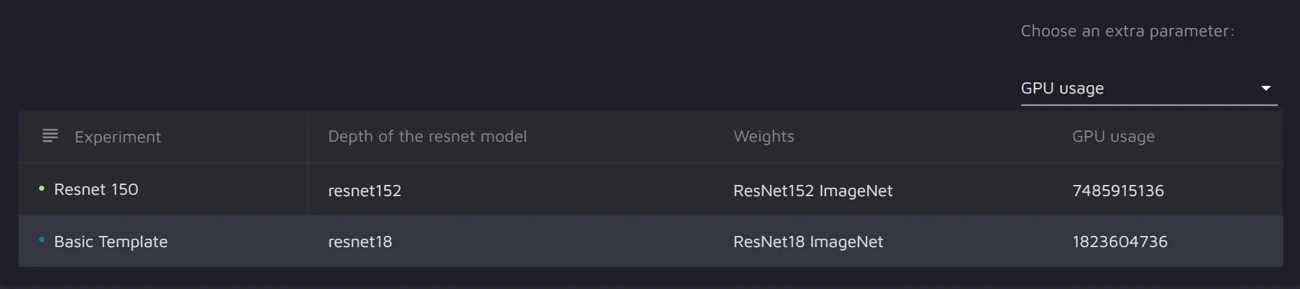 With the help of this widget, you can compare the models' hyperparameters, as well as GPU usage and train time.