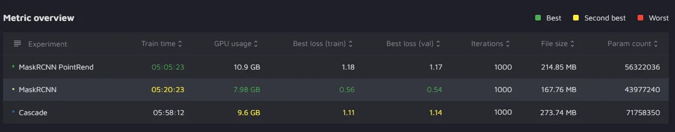 This widget allows you to overview metrics for different models and see which one performed best, second best, or worst. Metrics for both training and validation are available for comparison.