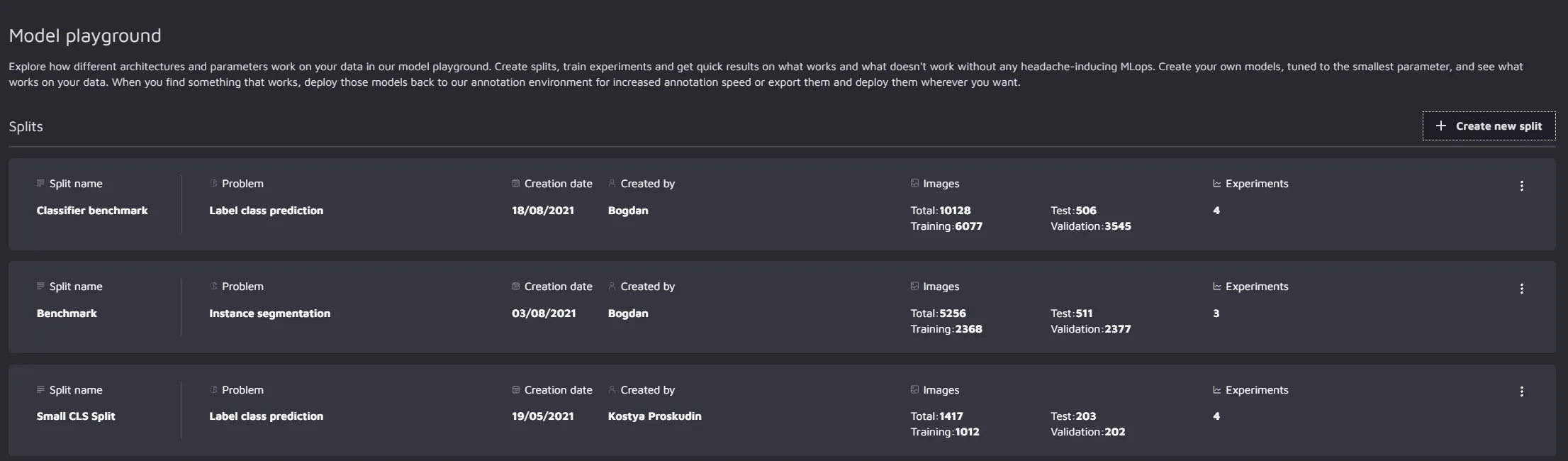 This page essentially gives an overview of the various splits already tried when a user enters the model building phase after data annotation and quality control steps.