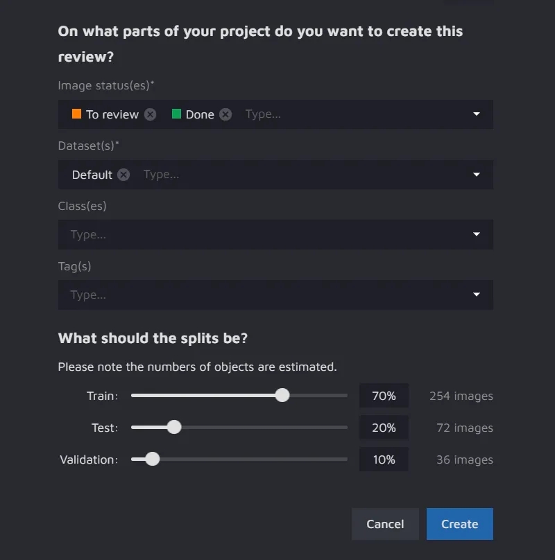 Split percentage ratio - tweak the percentage of images to be divided into the Train, Test, and Validation datasets. The default percentages for the Train, Test, and Validation datasets are 70%, 20%, and 10%, respectively.