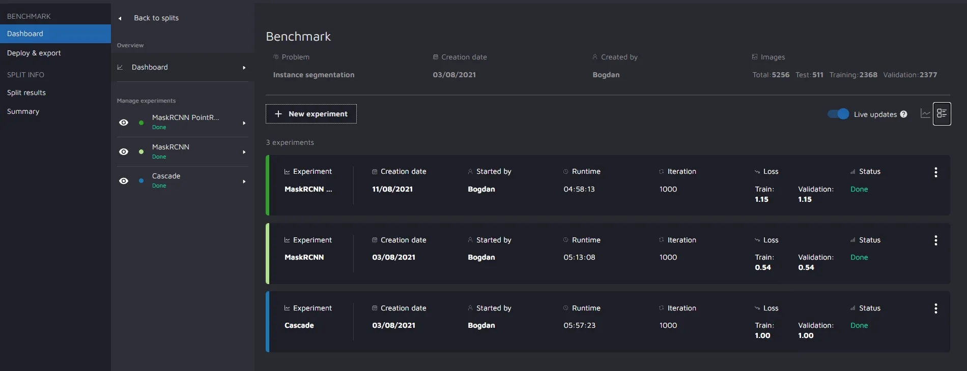 Under Manage Experiments, you can check the number of experiments tested by the user using a particular model type.
