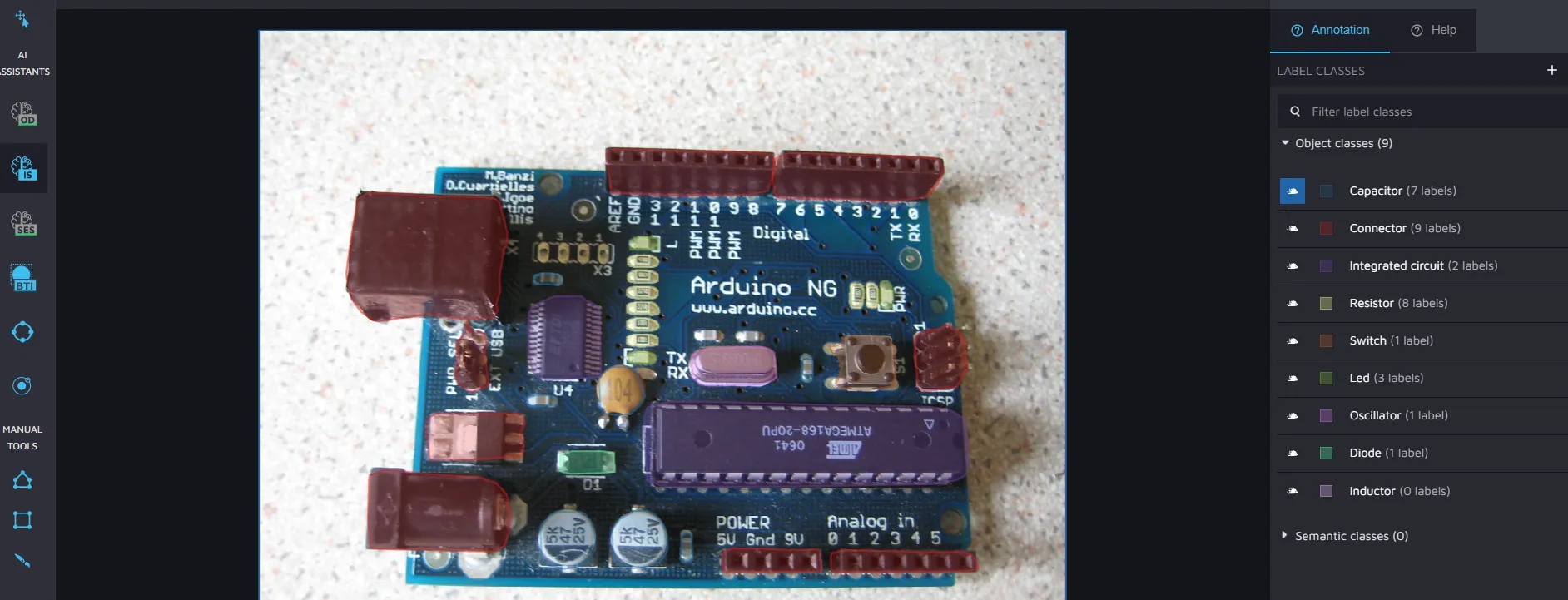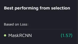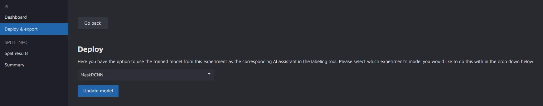 In the example above, we have chosen MaskRCNN as the model we would like to deploy to the training assistant, as it gave the best results during model building. After this, if we go back to the annotation environment and choose assisted labelling, the Instance Segmentation AI assistant will be using the MaskRCNN model for masks.