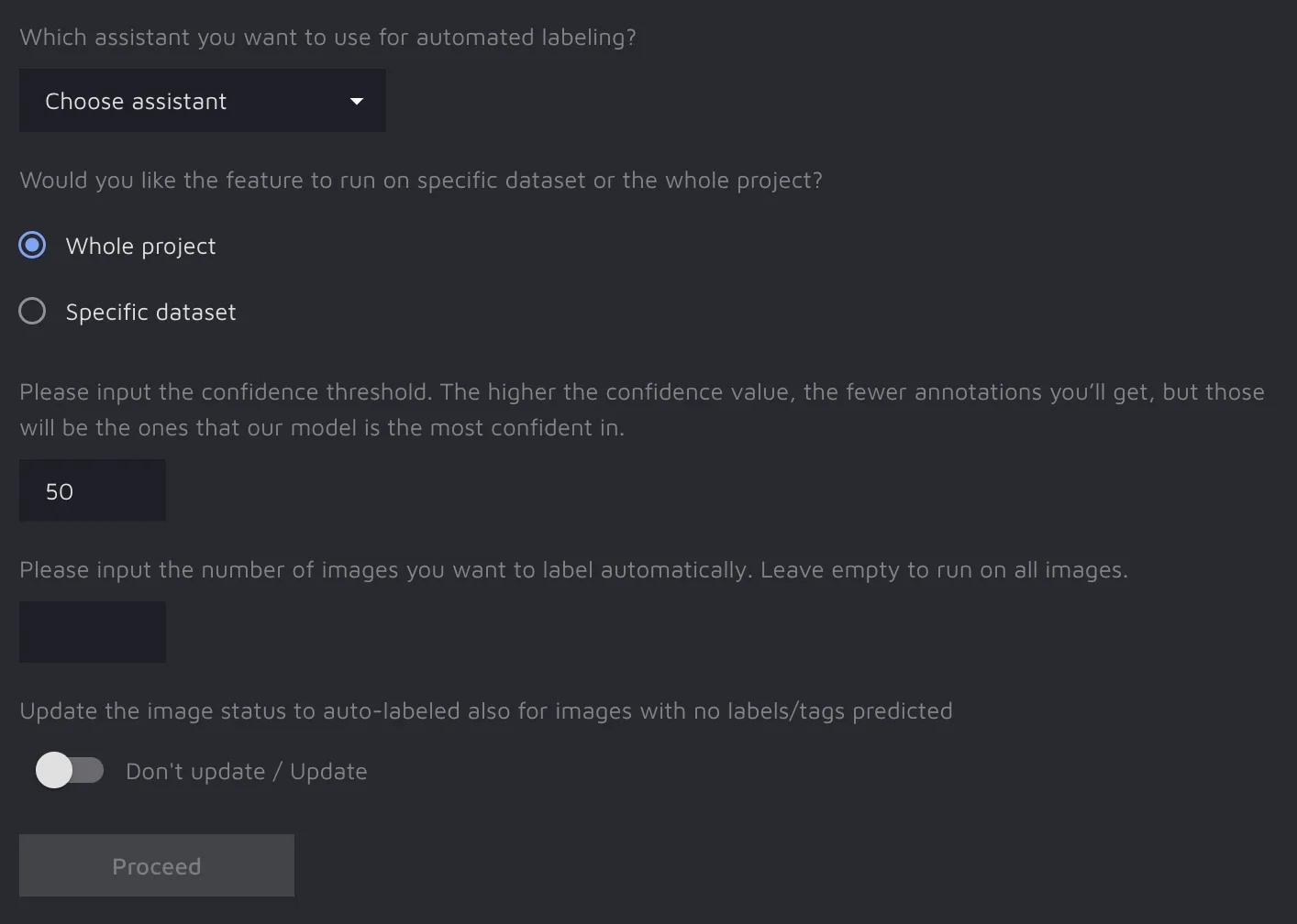 Don't update / Update toggle: this flag determines the feature's behavior if Automated labeling did not predict a single label or tag for an image: