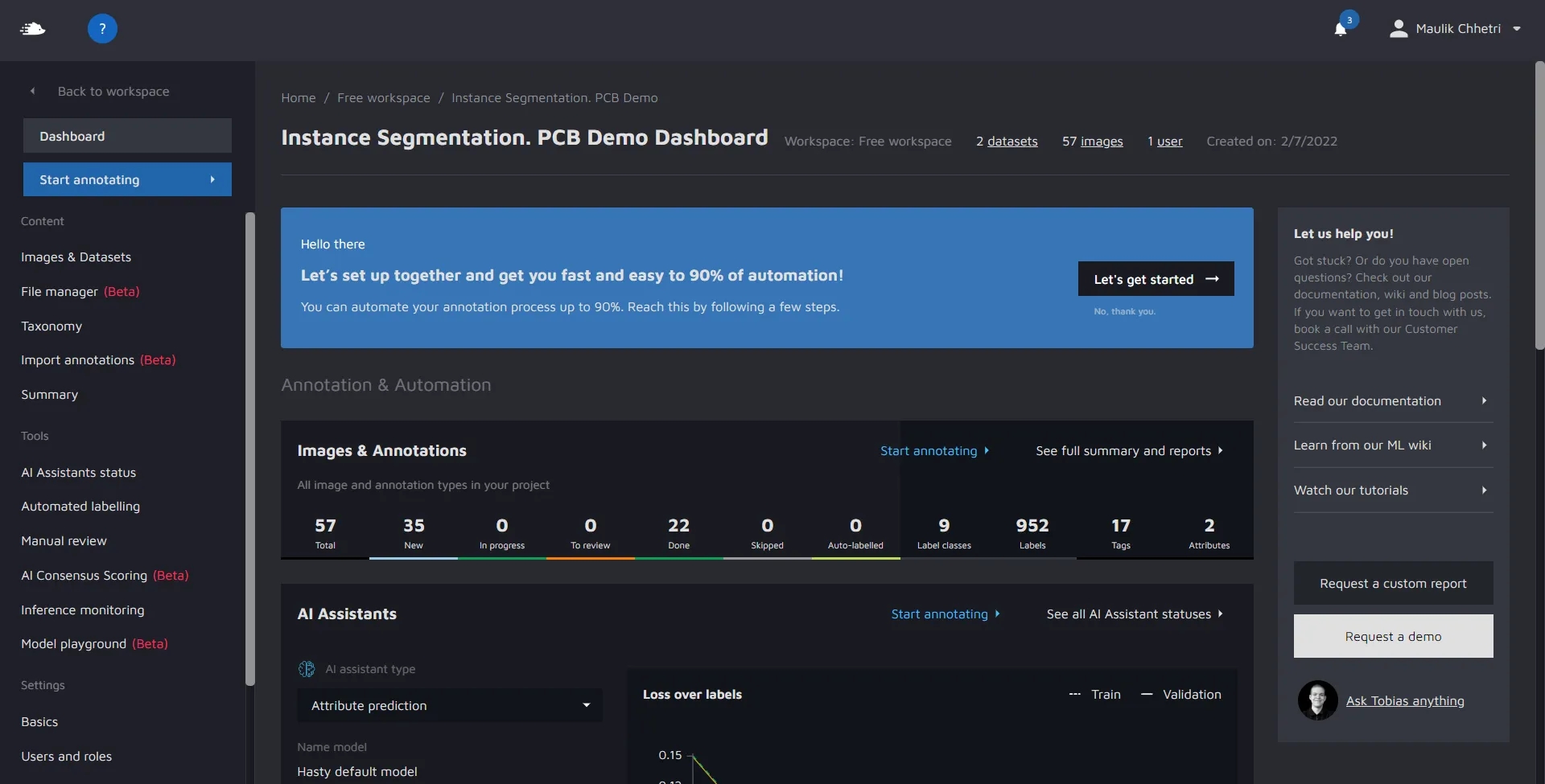 As you might see, the AI tools don't have blue icons like our manual tools do. That's because they either don't have enough data (green) or are training a model for you (orange). In this case, our Instance Segmentation Assistant is already training a model for you - which you can see by the colour being orange. As every model is created from scratch, we need 2-5 minutes to build a model for your demo project. Meanwhile, you can get started with...