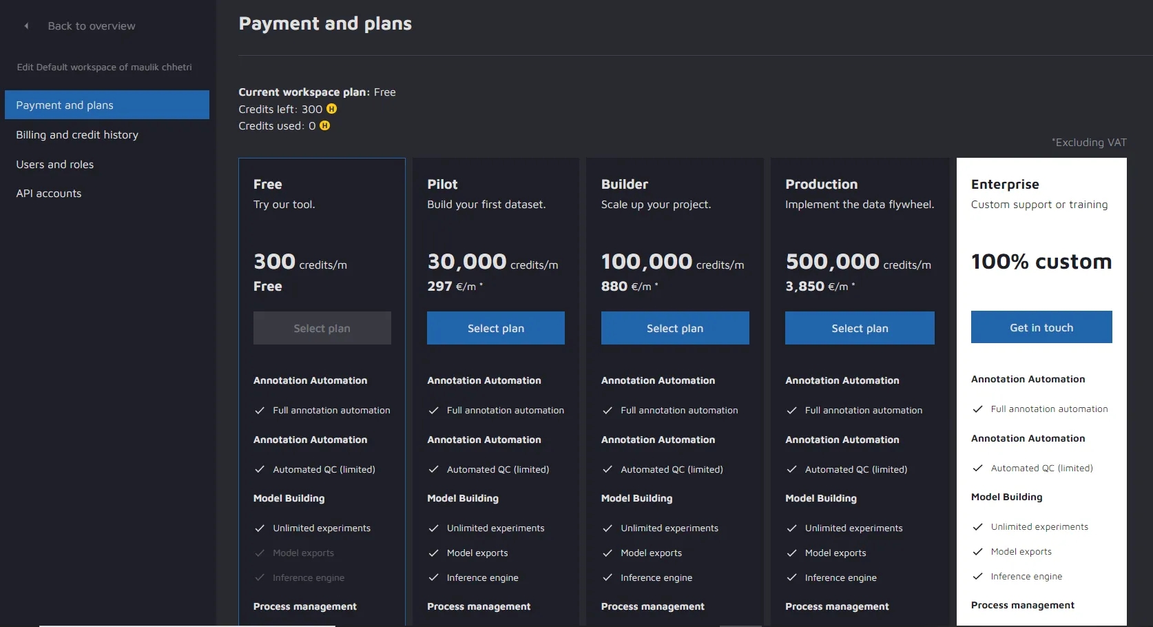 Here you can see your payment plans and handle your payment and billing details (excluded from the screenshot above). There are 5 different categories to choose from according to your needs. The five categories are Free (default), Pilot, Builder, Production, and Enterprise.