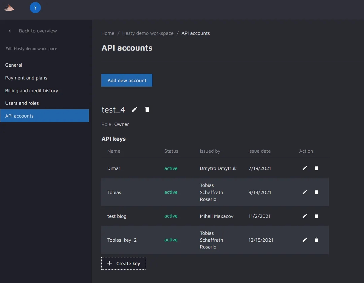In API accounts users who share that workspace can create an API key to use the Hasty API. To create a key, press the "Create key" button. Then, you will be prompted to name the key and set it to be active or inactive.