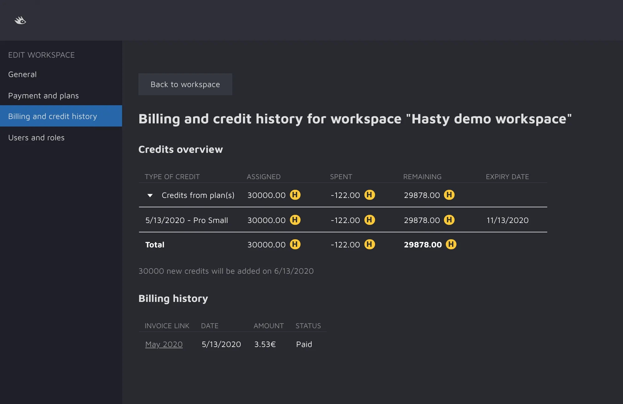 On this screen, you can see the available credits for your workspace. You can also see a breakdown of where those credits come from, as well as how many credits you have spent. You will also be able to see expired credits.