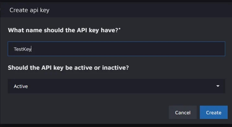 Here, the key has been named "TestKey" and has been set to active. On clicking the "Create" button, you will receive a long alphanumeric text which is the API key.