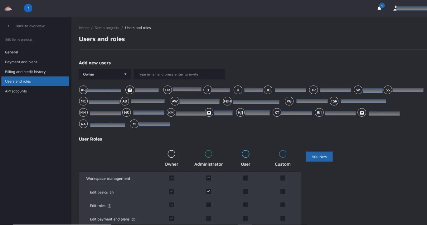 On this screen, you control access to your workspace as well as what those who have access to the workspace can do. It all works in a very similar way to how you set up access and permissions for individual projects, but access and permissions given here are much more powerful than those given for individual projects. That is because some permissions (more on which later) override specific project permissions - so even if you remove a user from "Project A" - that user can still have access to it if he/she has the right permissions in the workspace. Be mindful of that before inviting users.
